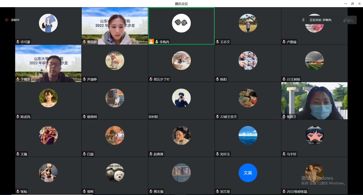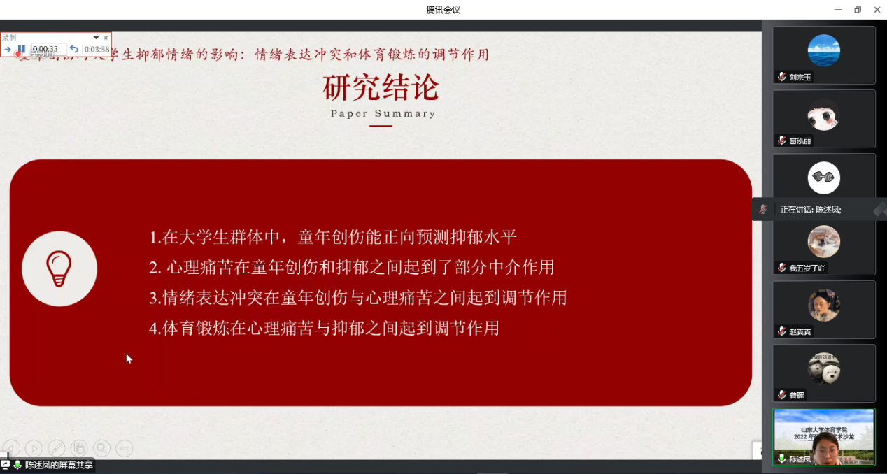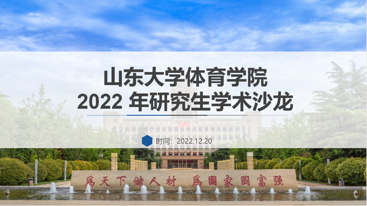 為加強校園學術文化建設,促進研究生學術交流,營造學術創(chuàng)新氛圍,提高研究生培養(yǎng)質量,山東大學體育學院于12月20日通過線上騰訊會議方式舉辦“學業(yè)·學術·學者·學風”研究生學術沙龍比賽活動。本次活動采用線上報告的形式,邀請2019級博士研究生王志文,2020級博士研究生羅亮,2021級博士研究生巫前錦、劉文昊、谷倩進行評審。活動由2022級碩士研究生葛泓麗主持,體育學院全體研究生參與聆聽了系列報告。